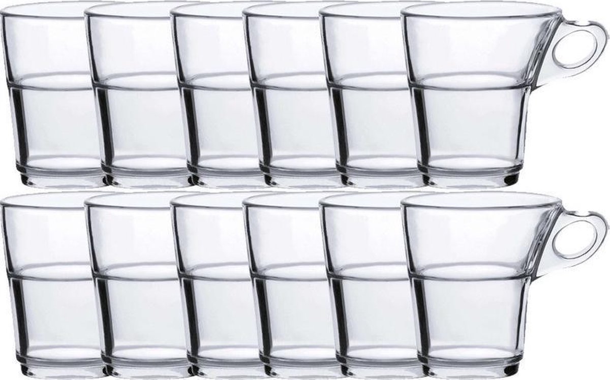 Twee sets met 6 koffie/espresso glazen, serie Caprice. Inhoud: 90 ml(9cl). Geschikt voor: vaatwasser, oven, magnetron en vriezer. Hittebestendig max. temperatuur (Celcius): 120. Vriezerbestendig min. temperatuur (Celsius): -20. Materiaal: hardglas. Formaat: Doorsnede: 6 cm. Hoogte: 7 cm. U ontvangt 12 glazen in totaal.