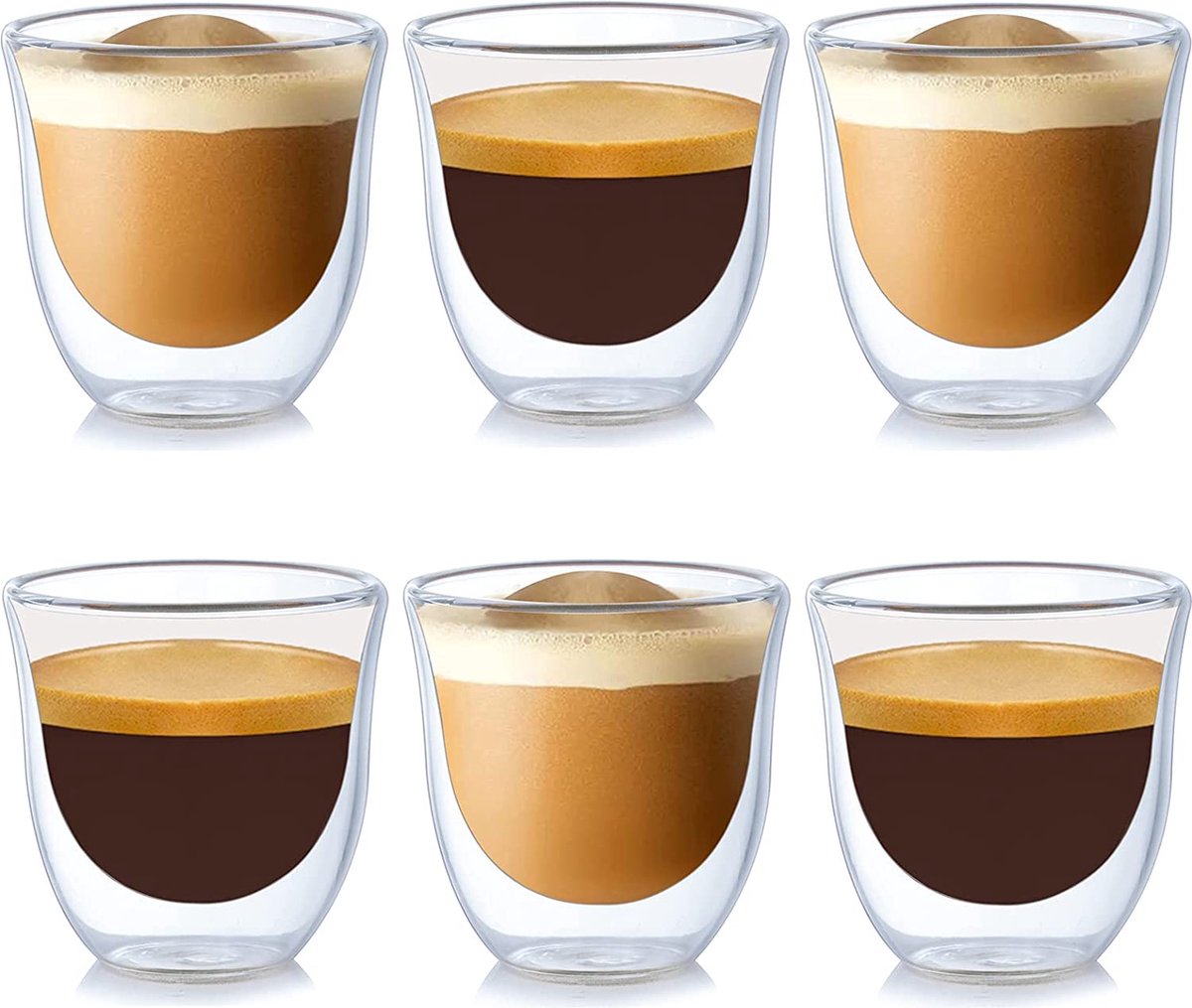 glazen, set van 6, 70 ml, espressoglazen, dubbelwandige espresso-kopjes, two-effect in 6-delige set, geschikt voor espresso, thee, ijsthee, cocktails, whisky